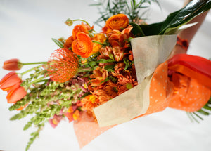 Alegres Ranúnculus y minirosas, destacan la maravilla del Leuco, envueltos en la sencillez y dicha de margaritas y tulipanes.